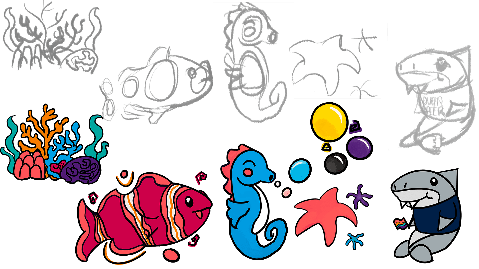 The Queer Peers programming is a series of transitional events and structured orientations for new or change-of-campus students at Penn State. This year, the theme was deep sea exploration. I had the pleasure of developing, drawing, and creating the character of Travis the Shark, a friendly mascot that represented the transitional celebratory marketing. Travis can be seen as a sticker, plush, and on various graphics I created. Read and see more of the assets here.