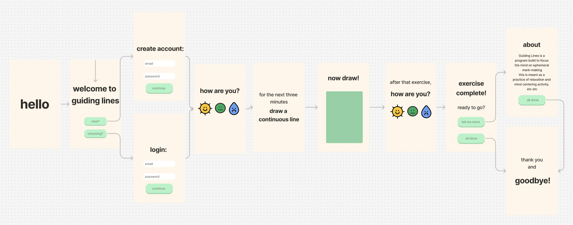 Guiding Lines is a Progressive Web App built with Javascript, CSS, HTML, and prototyped in Figma. The project was built around the prompt of creating a ritual that combines technical skills with creative methods of rest. I decided to iterate around the concept of a practice of "brain-dumping", using a singular line to focus and decompress.