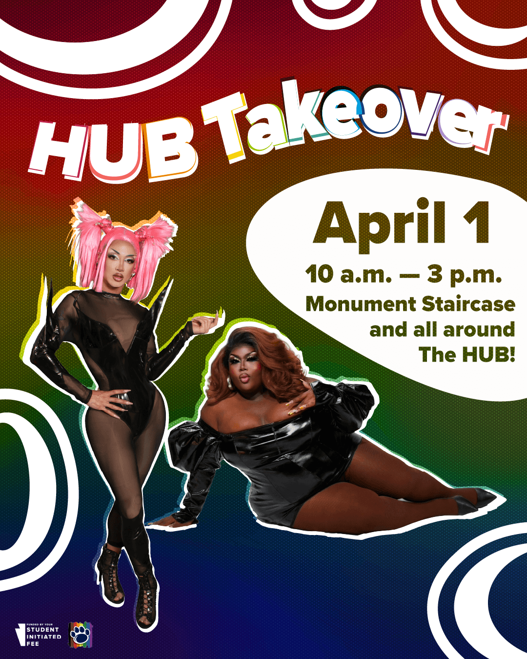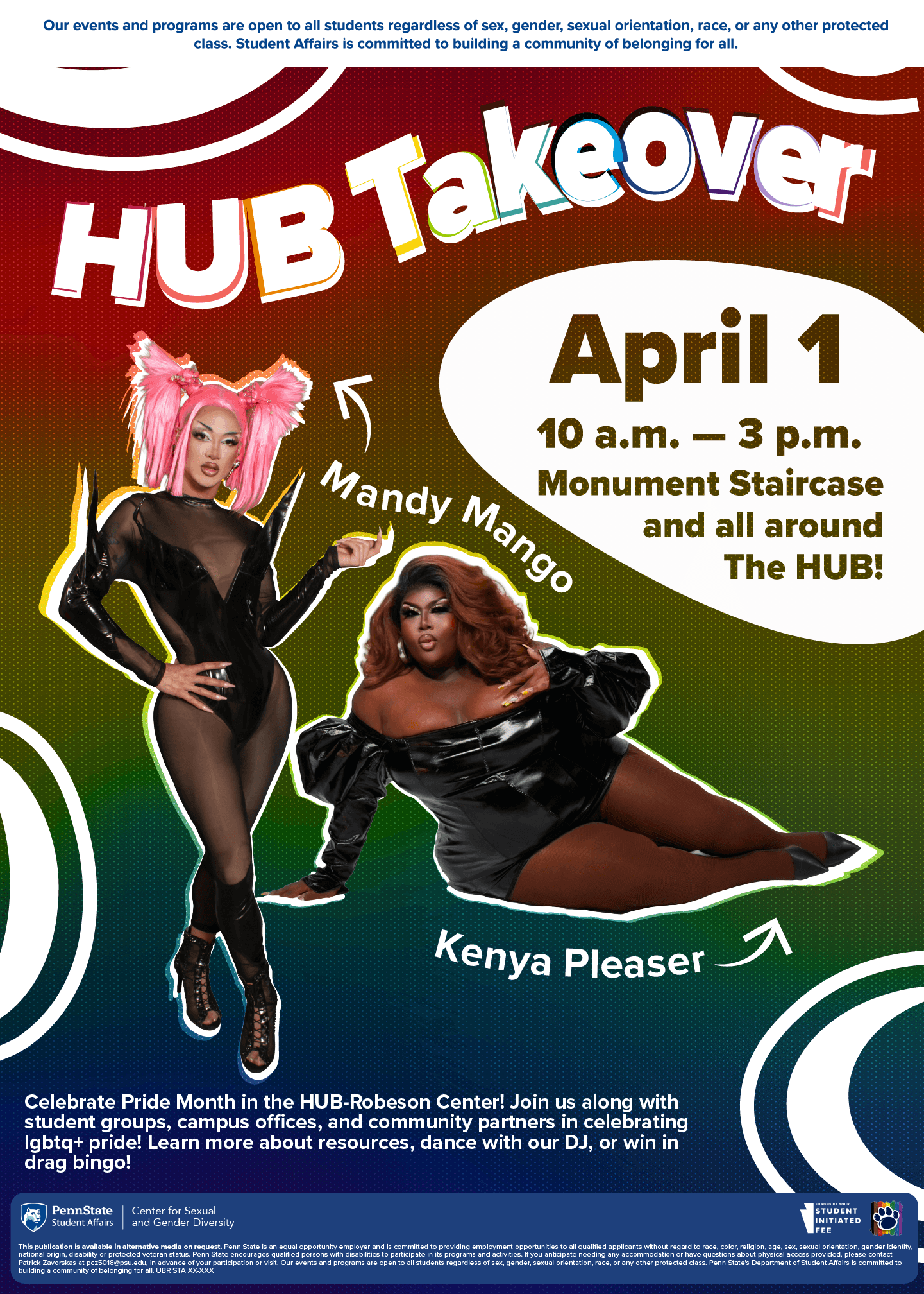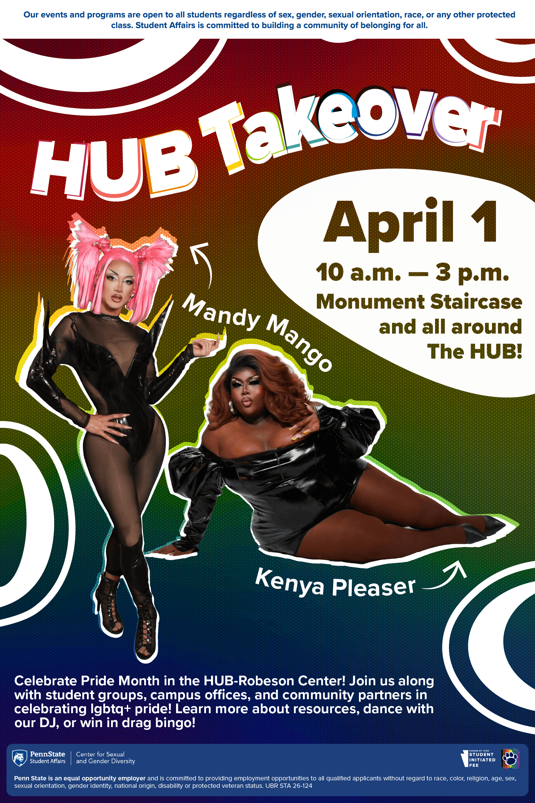 Every April the CSGD celebrates pride through a variety of tailored events. This year I had the privilege to design a visual suite for the HUB takeover and coinciding events. I was given headshots and the prompt to "make it POP honey", and worked to do just that. HUB takeover is the largest event of the three, and the other events were coinciding or leading up. Altogether, I created a very vibrant, organic, and POPPING visual suite able to be tailored to a variety of shows as well as more subdued events. All graphics had to be presented to core staff using Apple Suite.