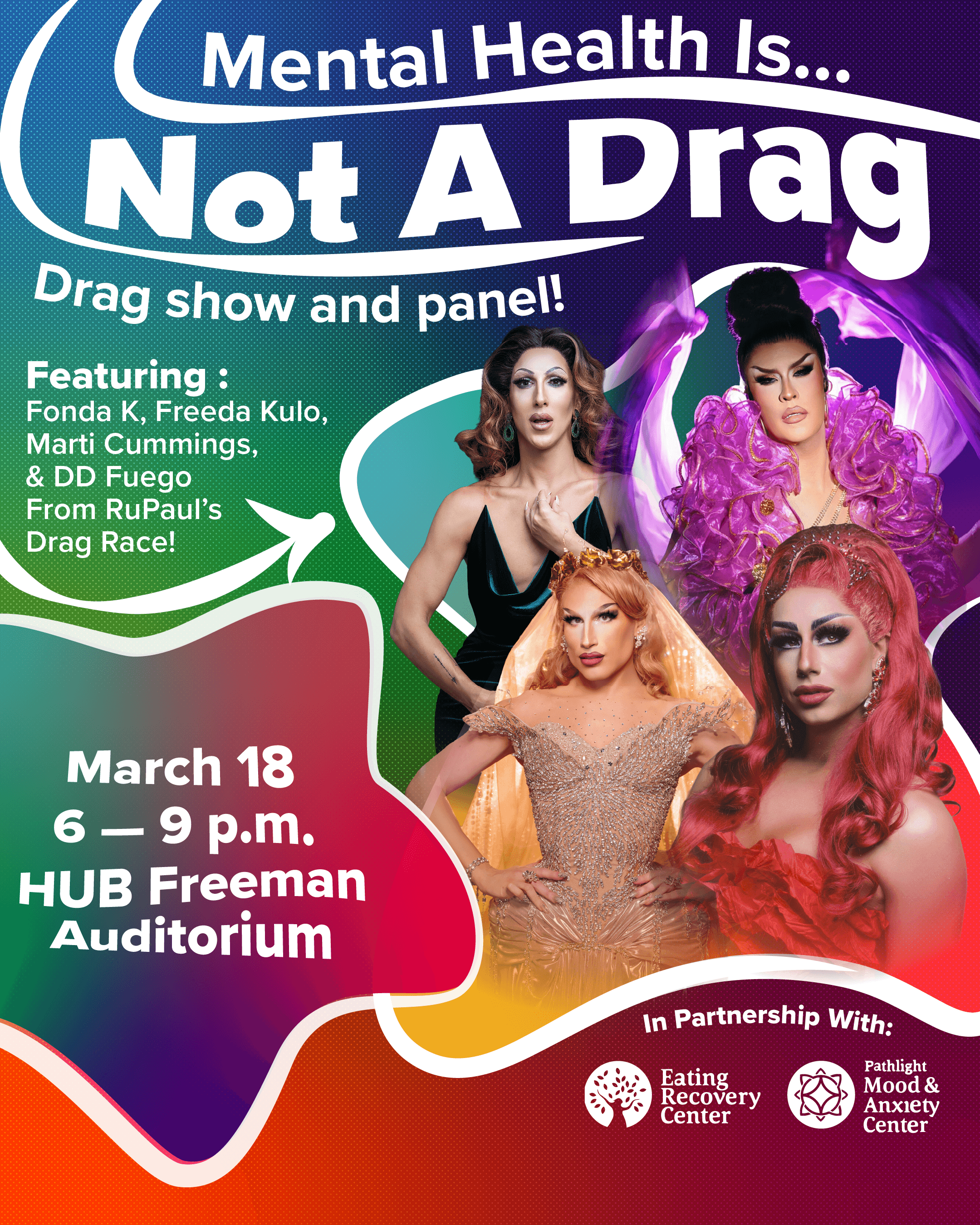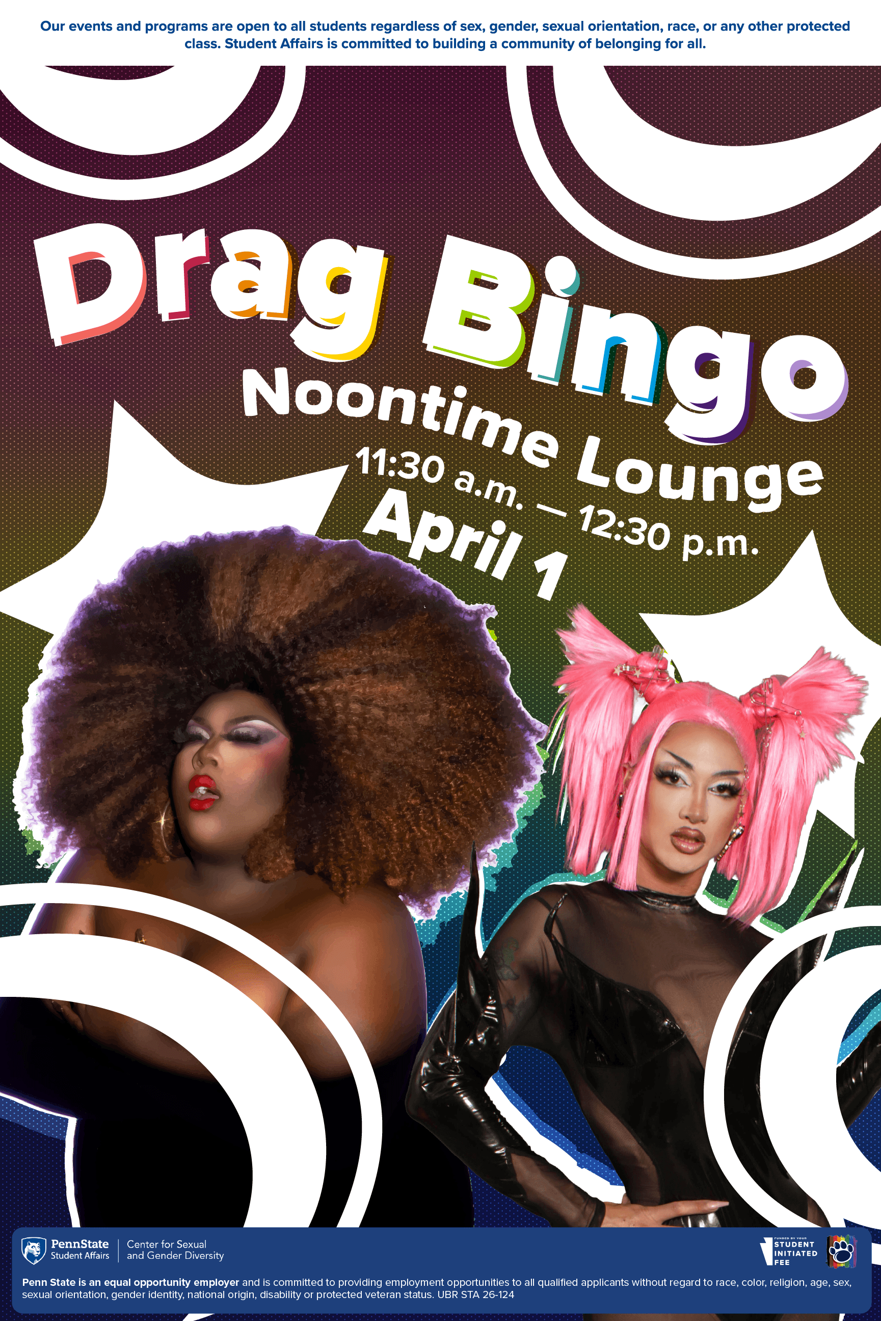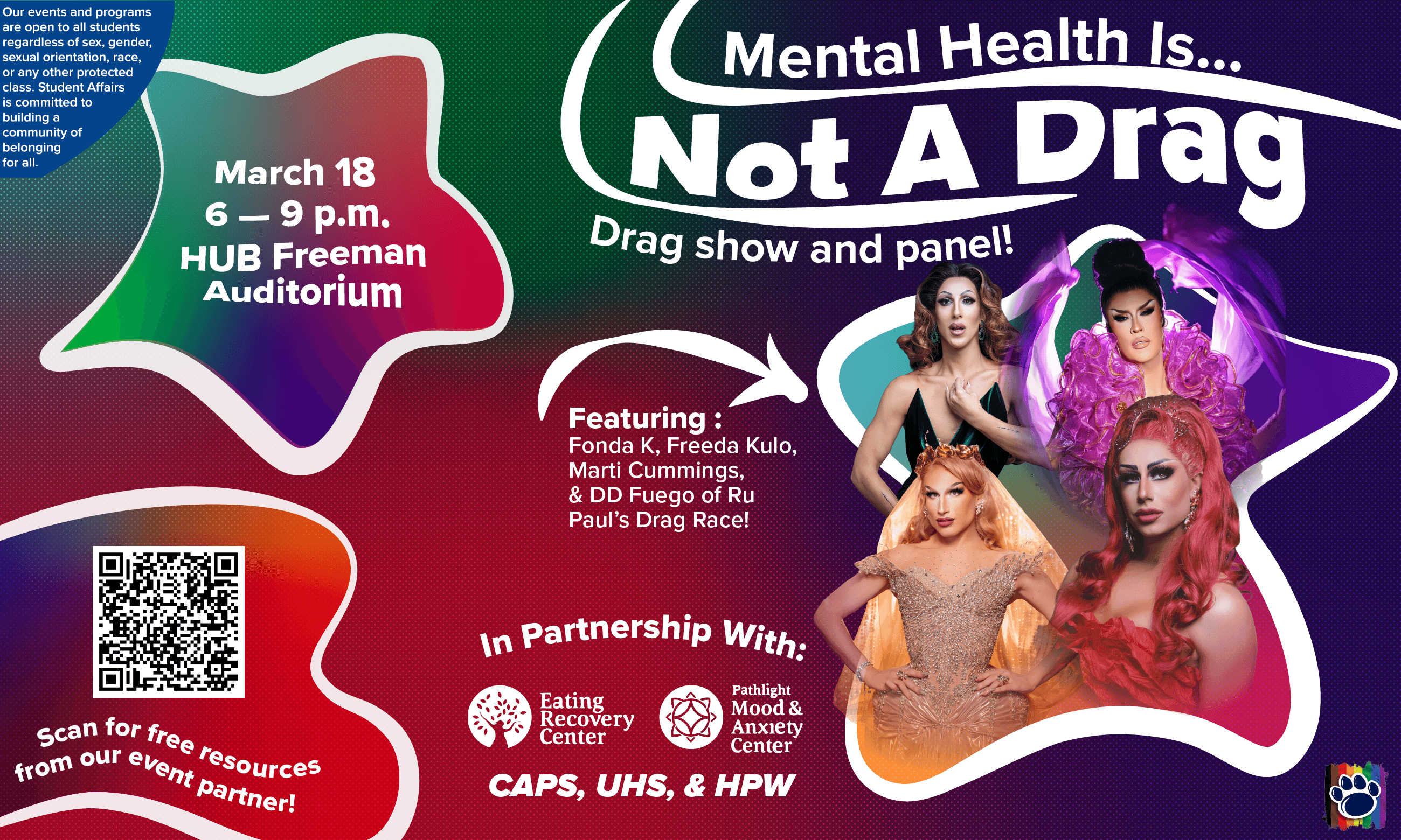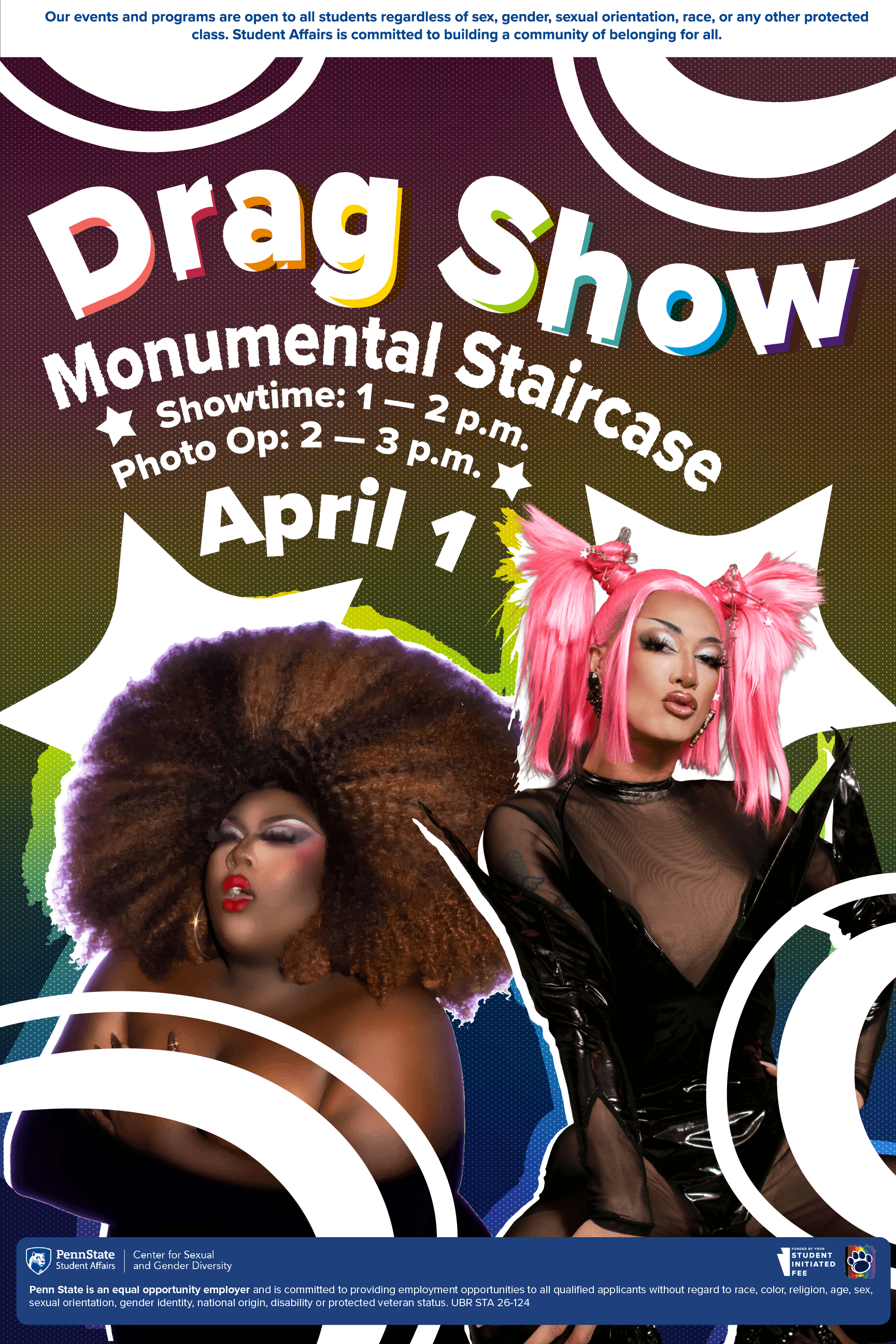 Every April the CSGD celebrates pride through a variety of tailored events. This year I had the privilege to design a visual suite for the HUB takeover and coinciding events. I was given headshots and the prompt to "make it POP honey", and worked to do just that. HUB takeover is the largest event of the three, and the other events were coinciding or leading up. Altogether, I created a very vibrant, organic, and POPPING visual suite able to be tailored to a variety of shows as well as more subdued events. All graphics had to be presented to core staff using Apple Suite.