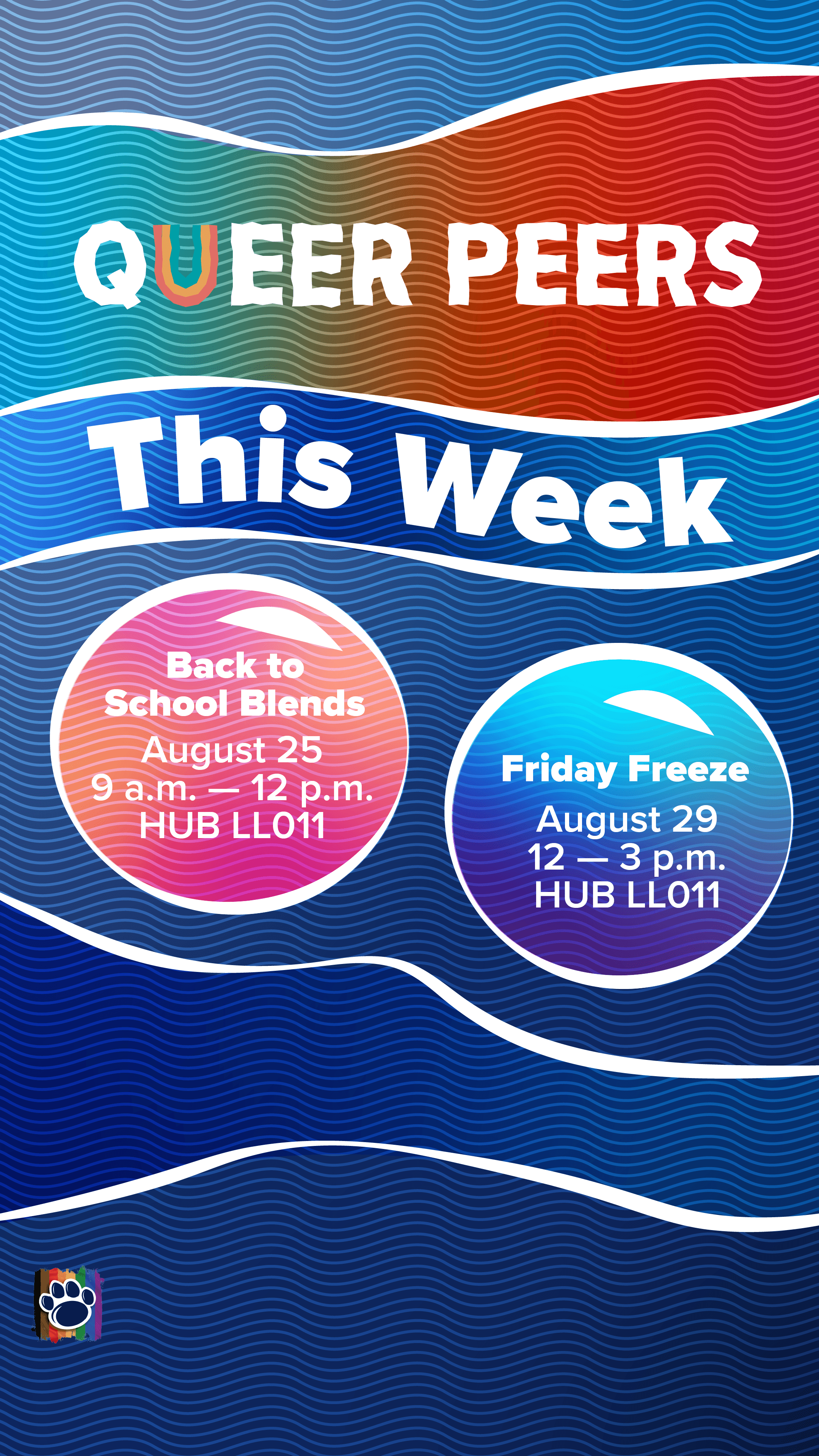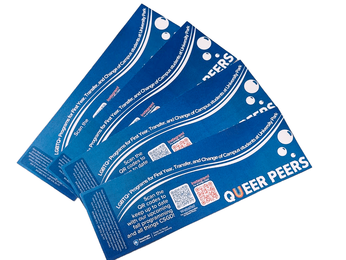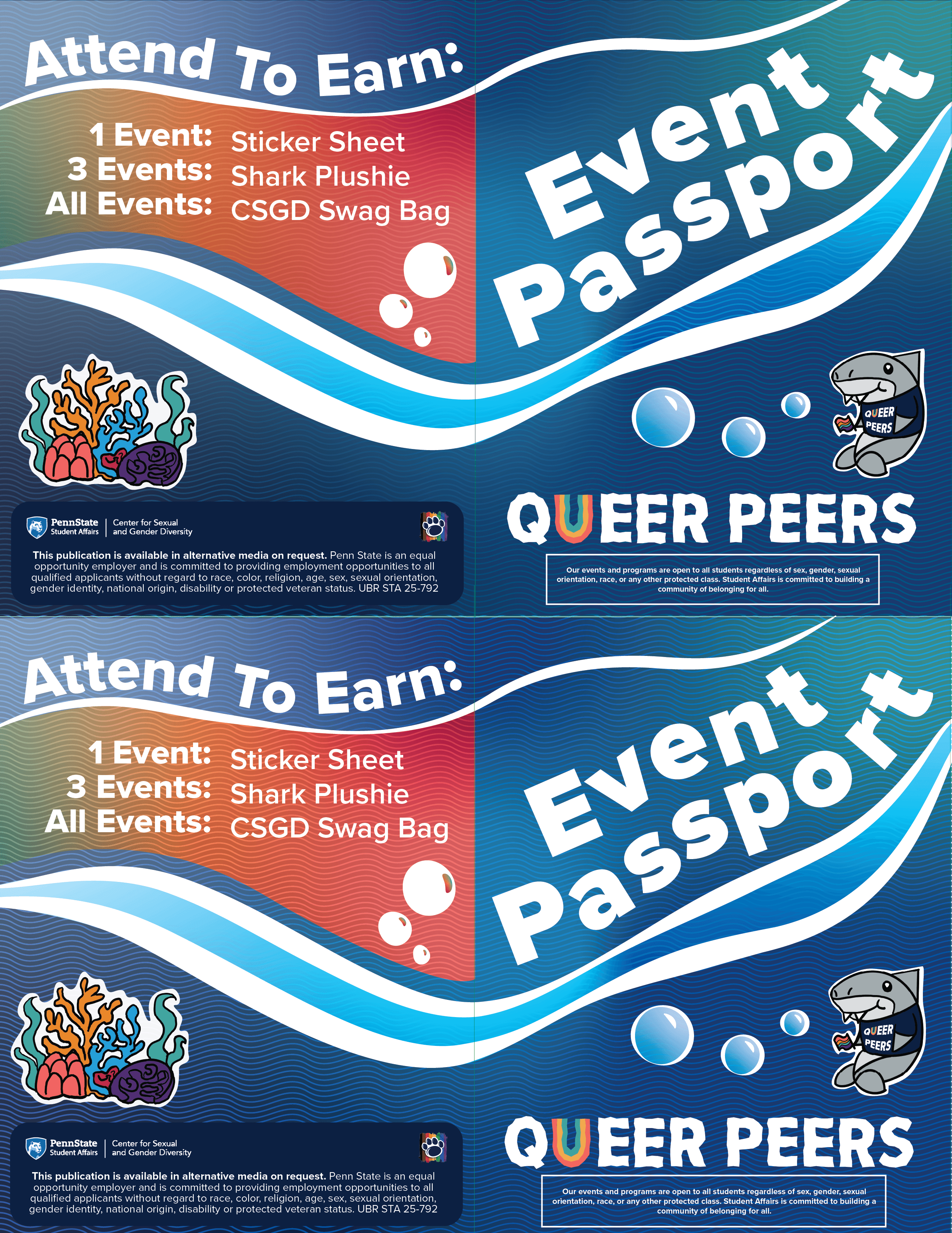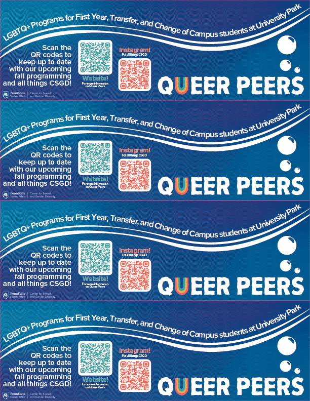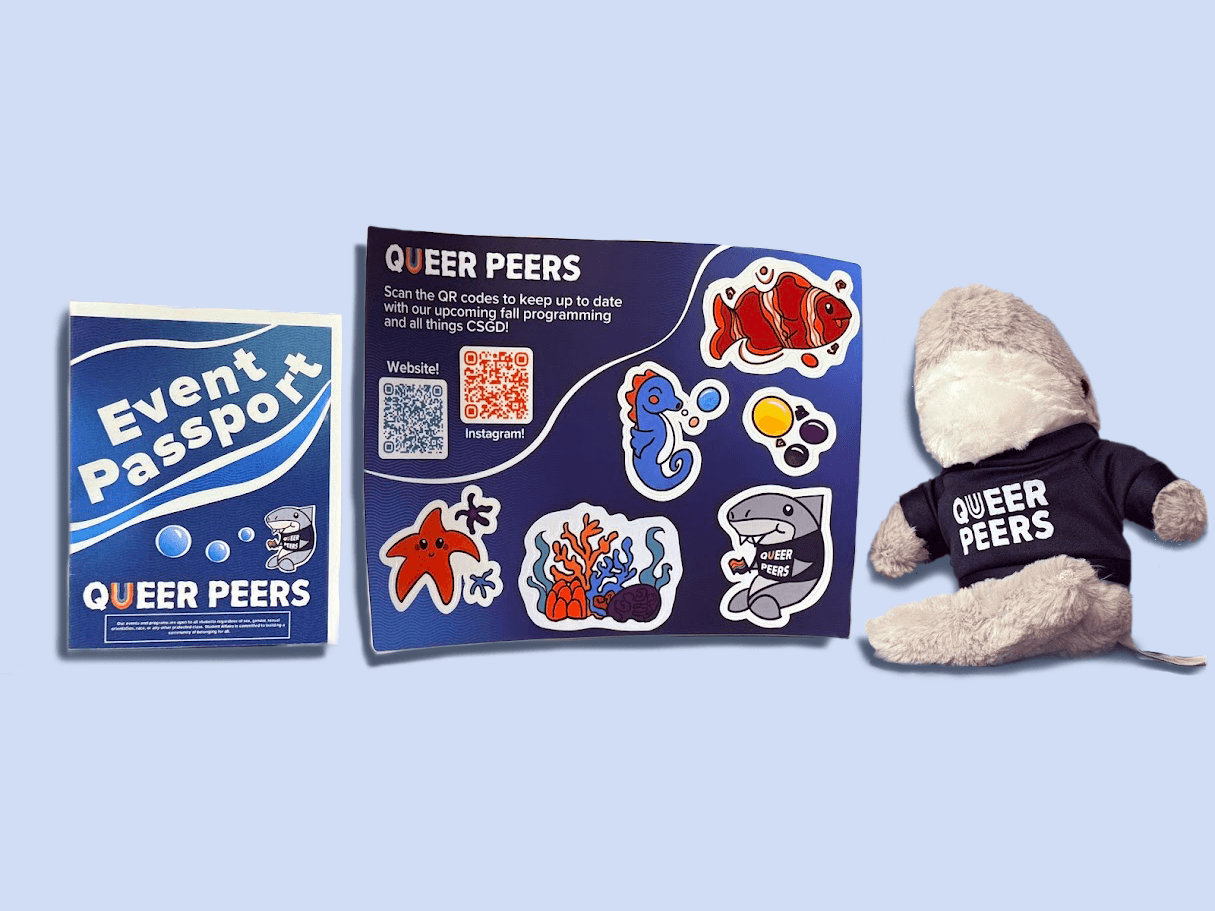Queer Peers is an introductory program in which new campus students are invited to participate in a series of exclusive programming centered around orientation, connection, and celebration of identity. The brief for this year was a theme of "underwater deep sea exploration". Within this theme, I created a sticker sheet, bookmarks for tabling, event passport, and digital/print signage templates that could be consistently updated within my team. The stickers, color scheme, and logo materials were hand-drawn and then vectorized. The rest of the work was done within Illustrator and Indesign. Altogether, this was a well-received season and series of graphics with high student engagement and increased Instagram reach.