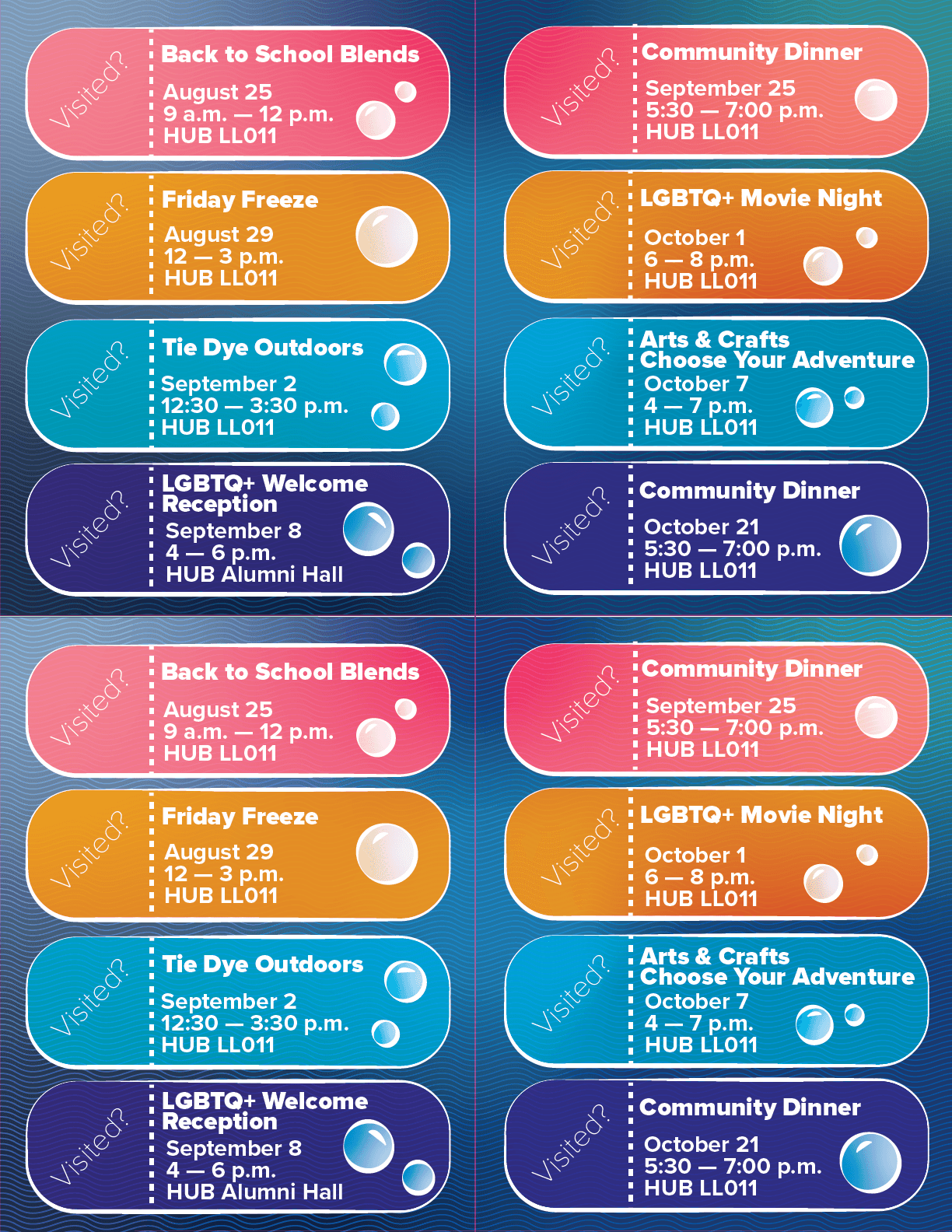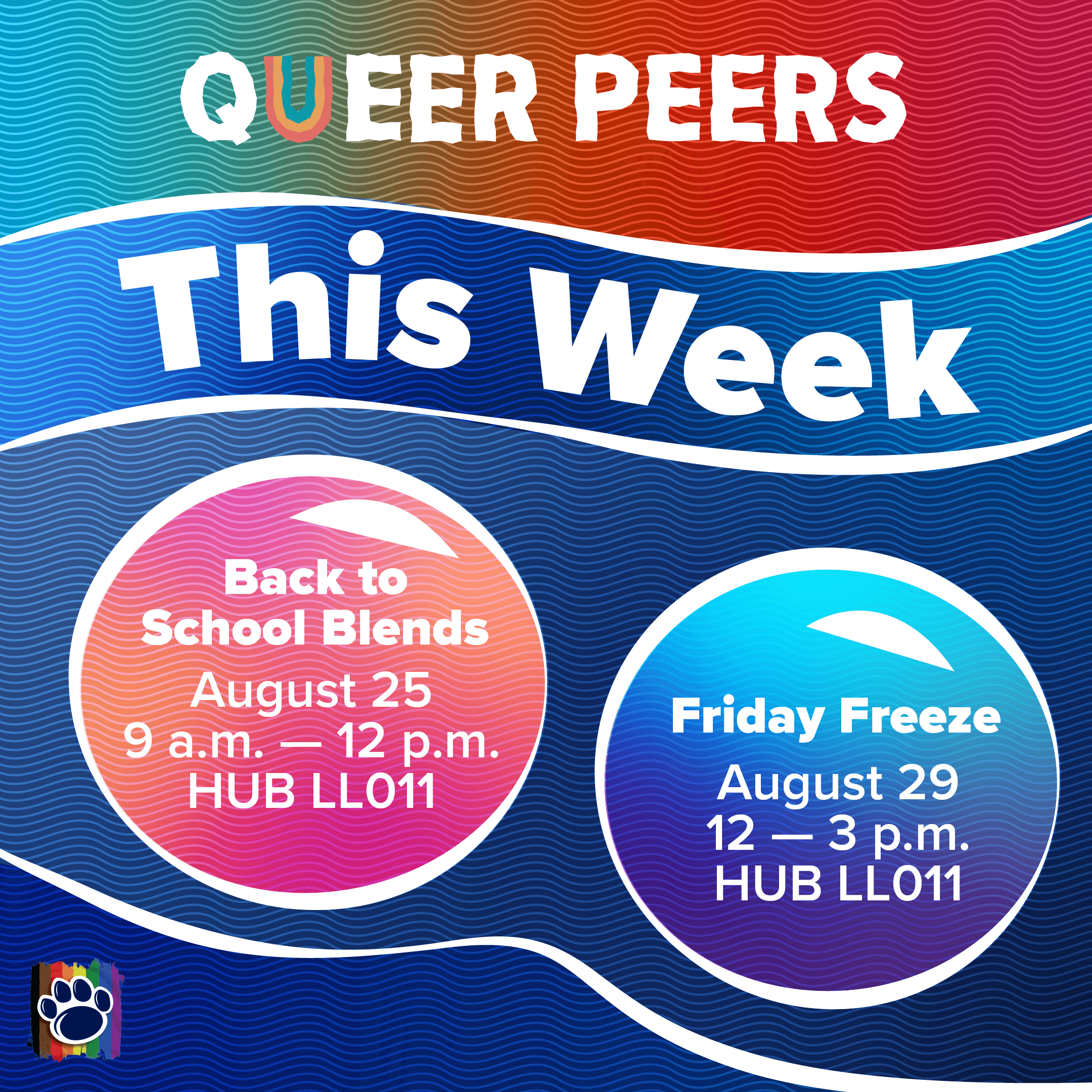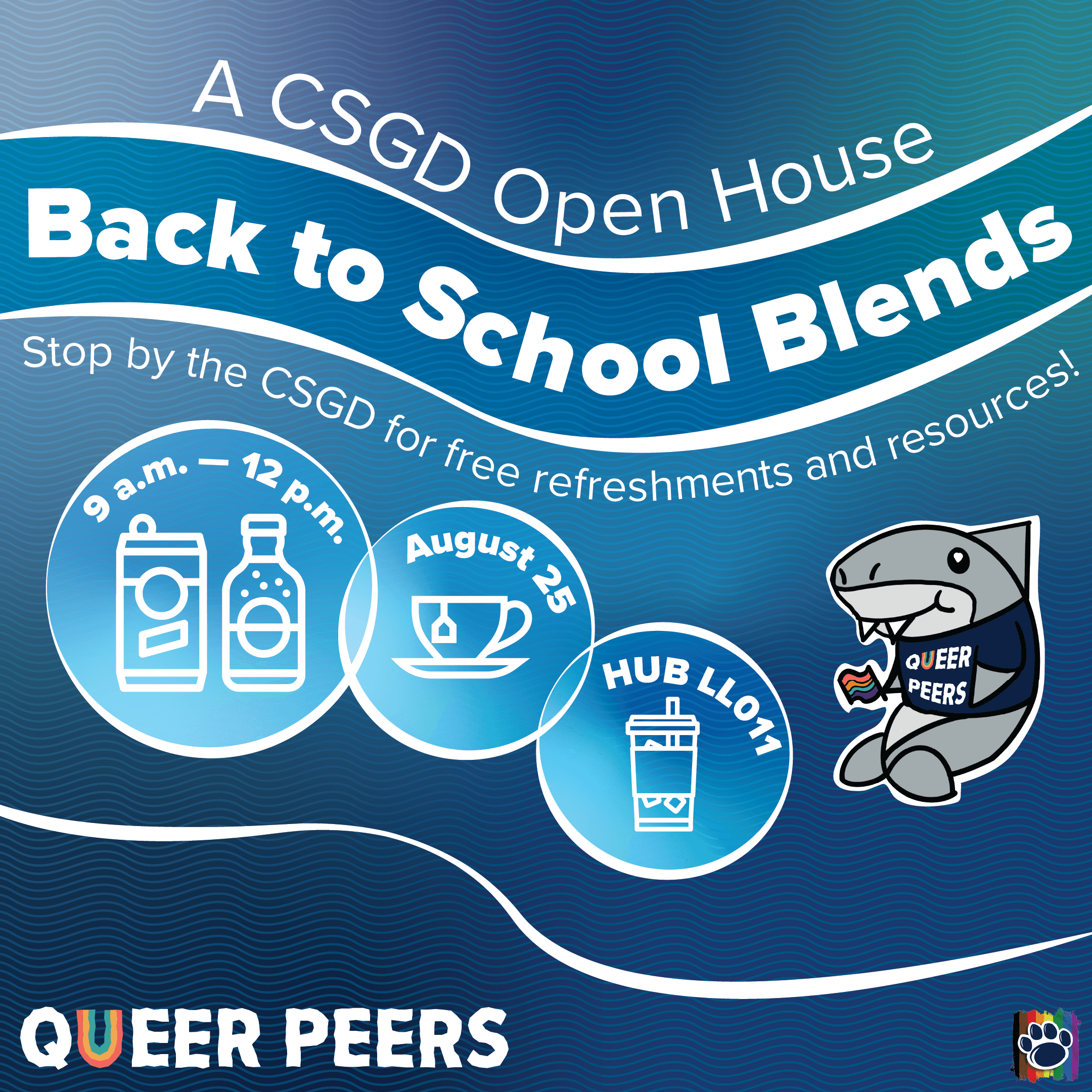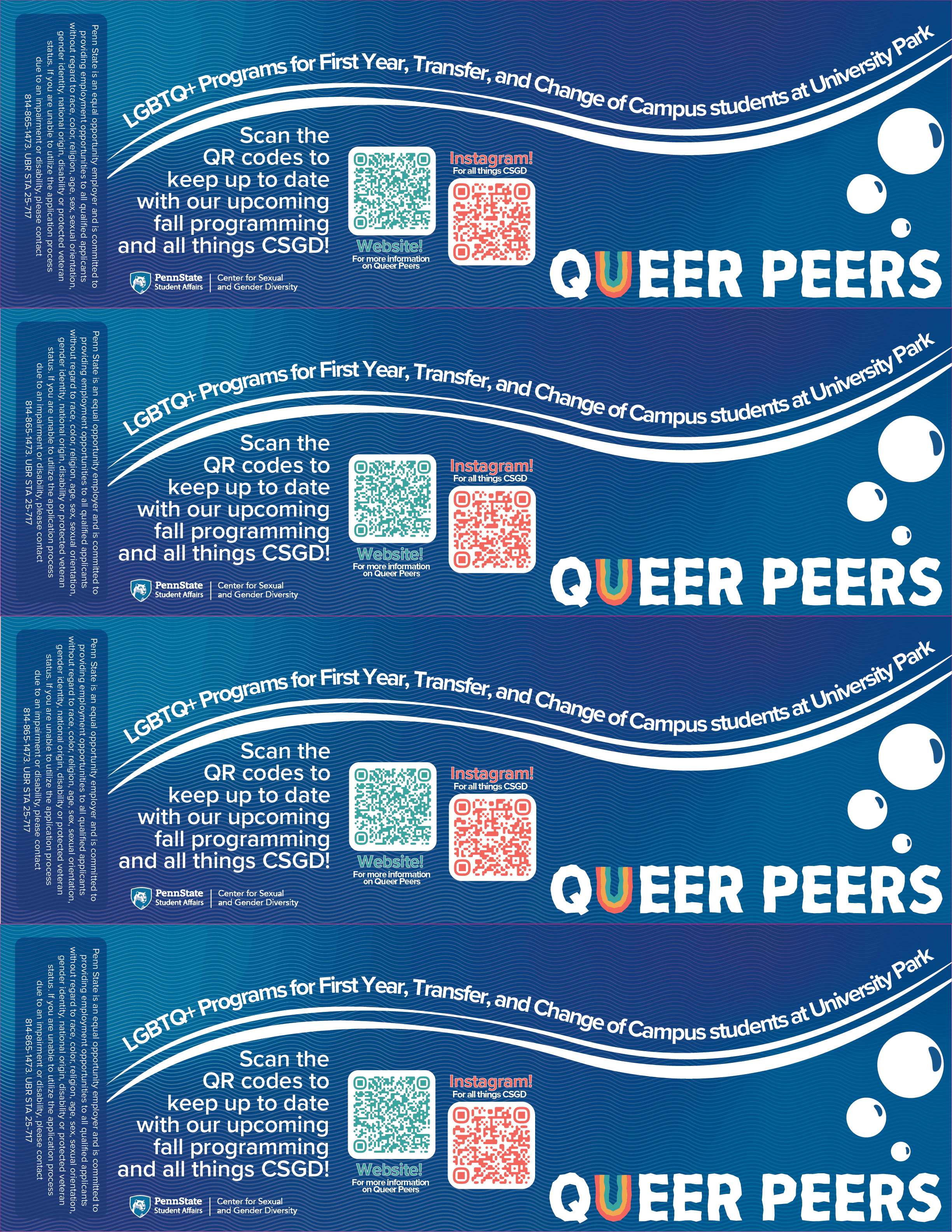 Queer Peers is an introductory program in which new campus students are invited to participate in a series of exclusive programming centered around orientation, connection, and celebration of identity. The brief for this year was a theme of "underwater deep sea exploration". Within this theme, I created a sticker sheet, bookmarks for tabling, event passport, and digital/print signage templates that could be consistently updated within my team. The stickers, color scheme, and logo materials were hand-drawn and then vectorized. The rest of the work was done within Illustrator and Indesign. Altogether, this was a well-received season and series of graphics with high student engagement and increased Instagram reach.